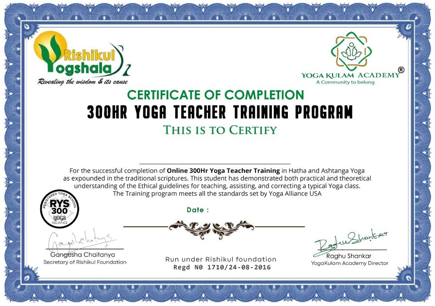 Yogakulam Academy is a Registererd Yoga School with Yoga Alliance (RYS300). After succesful completion of the course, we will award you the 300- hour Yoga Teacher Training Certificate (RYT300) accredited by Yoga Alliance, USA. This certificate is recognized internationally by Yoga Alliance and International Yoga Federation.